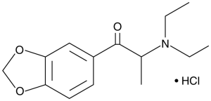 The complete chemical formula of Diethylone: 1-(benzo[d][1,3]dioxol-5-yl)-2-(diethylamino)propan-1-one, monohydrochloride.