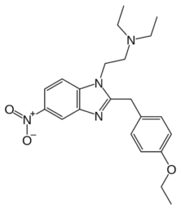 Etonitazene is an opioid analgesic, first synthesized in the 50s of the last century. Etonitazene has a strong opiate potential, approximately 60 times stronger than morphine. It is a type of benzimidazole opioid, structurally associated with clonitazene (p-ethoxybenzyl group is replaced by p-chlorobenzyl group). With caution in chemical studies in rodents, since at a high dosage, side effects are possible: respiratory depression, vomiting, death, can be addictive.